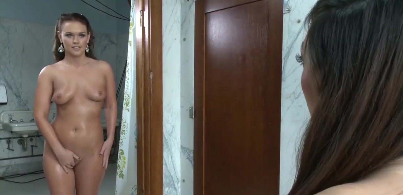 Horny Asian shemale Venus Lux follows sexy brunette babe Roxy Raye from sauna to toilet and there with huge dick fucks her in pussy and ass