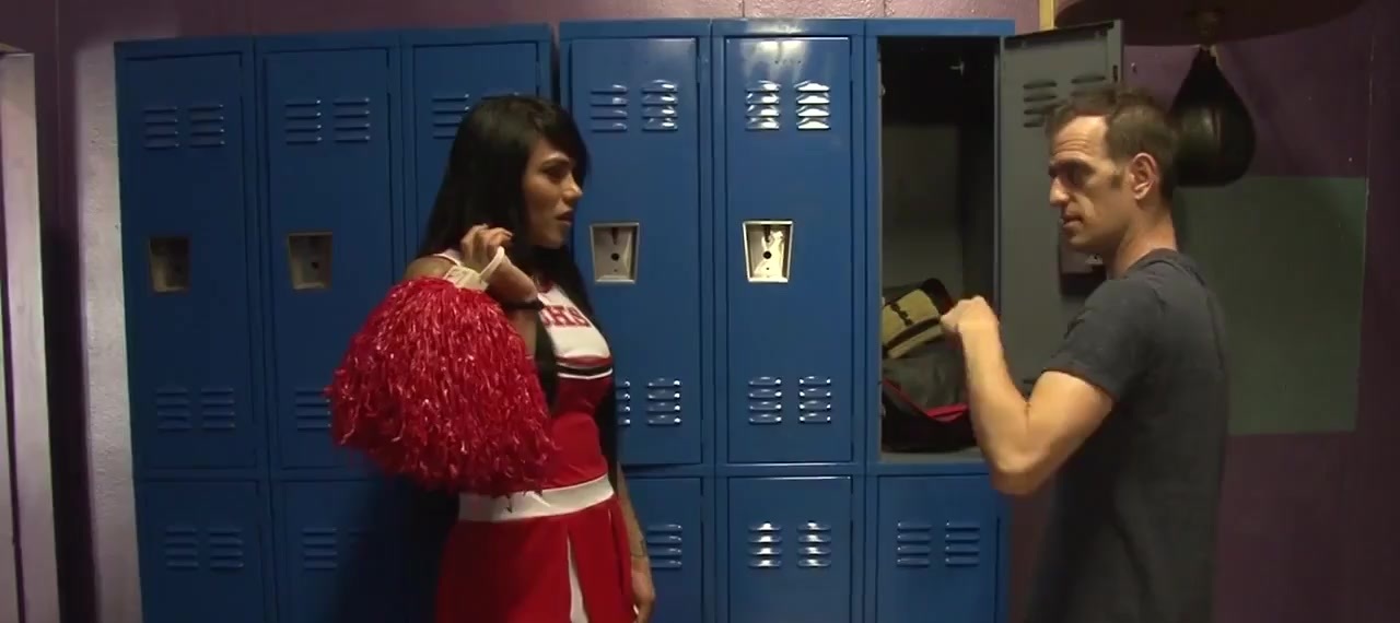 2 guys pull out their big dicks for trans cheerleader Diamond Dixon to suck in interracial 3some.They suck the uniformed tgirls big tits and then the brunette shemale is rimmed as the tranny is deepthroat facefucked.Then the busty ts gets anal fucked