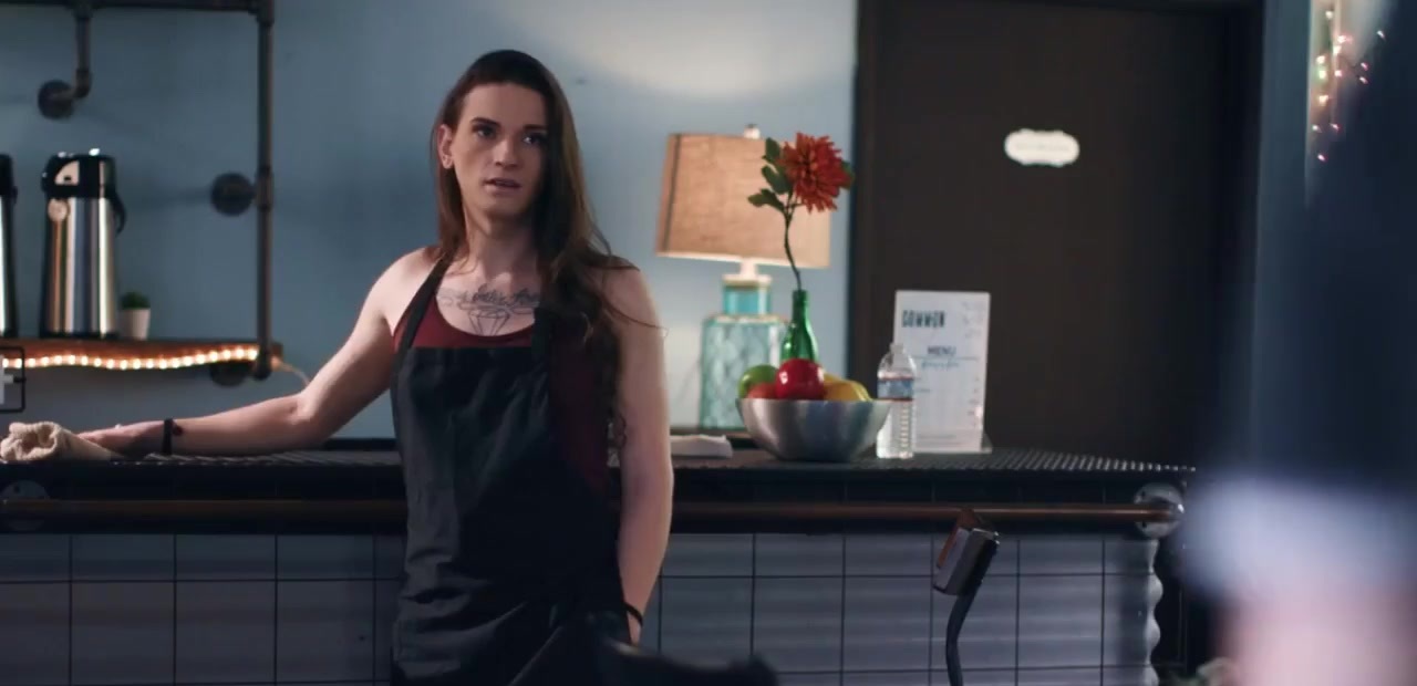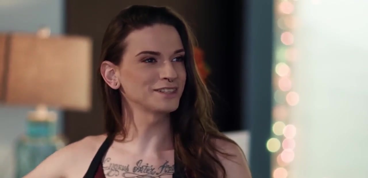 Beardy man Chris Epic visits sexy brunette shemale barista Jenna Creed in hor loft and there gets blowjon then shoves hard cock up her tight ass on the sofa