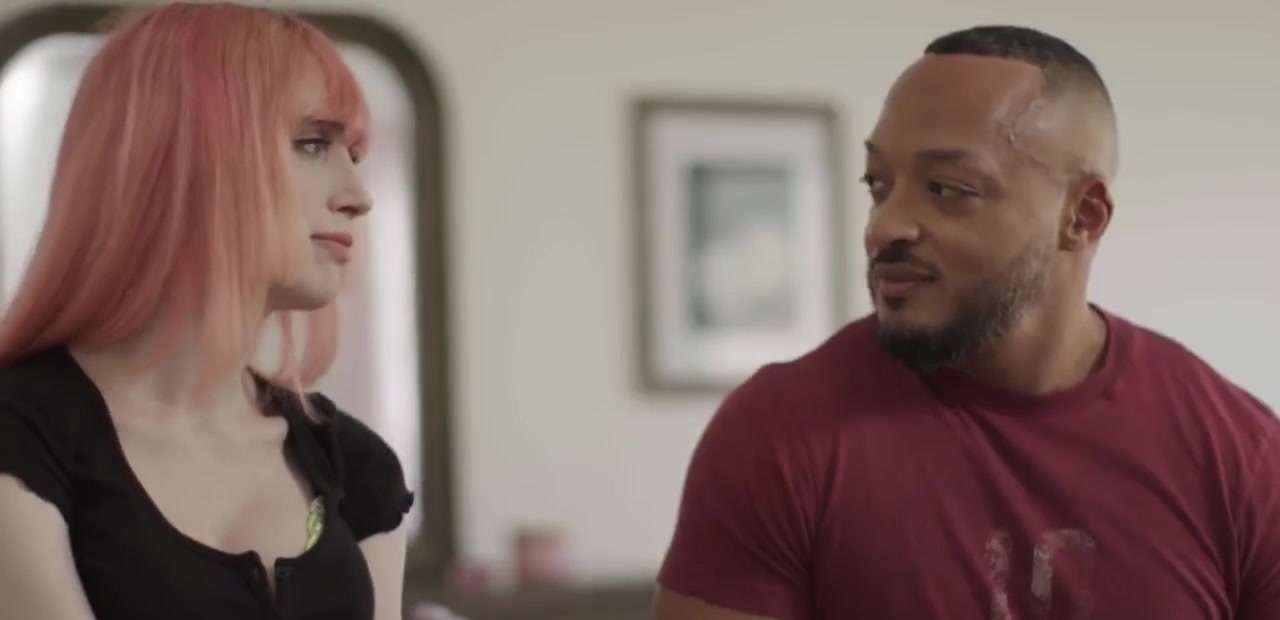 Black stepbro and his pink haired TS stepsis are on the bed kissing each other passionately.After that,he lets her throat his big black cock passionately and in return,he bareback fucks her tight wet ass so deep and hard.