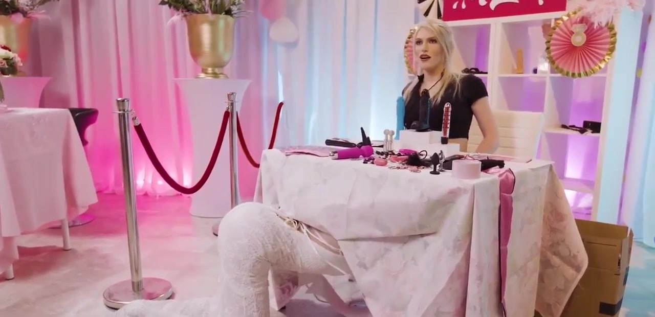 Busty TS and her workmate are busy setting up a bridal sex toy booth.The bride picks the wrong sex toy and she throats the shecock of blonde TS under the table.Her workmate arrives and instead of getting mad,they do threesome sex.