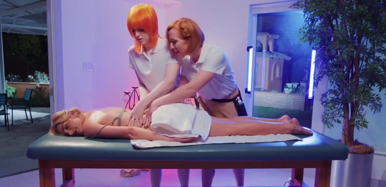 Redhead shemale girlfriends Jean Hollywood and Shiri Allwood giving massage to hot naked blonde babe Kenzie Anne then fucking her in mouth and pussy in threesome