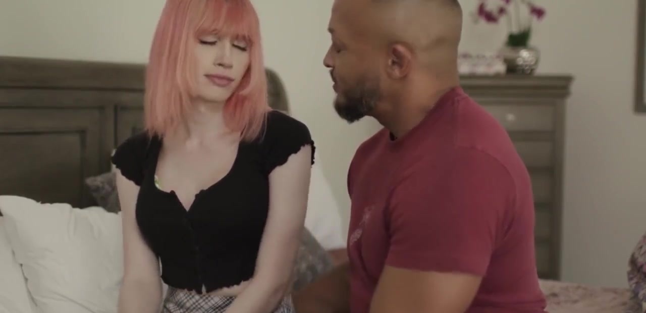 Black stepbro and his busty pink haired TS stepsis are on the bed kissing each other.After that,she lets him lick her ass first and in return,she throats his hard big cock passionately and rides it after.