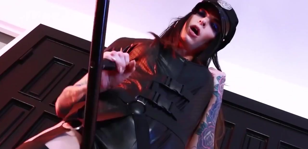 Inked TS Chelsea Marie wears sexy police uniform to jerk off! This hot tbabe works on that hard cock until cum starts blasting out!