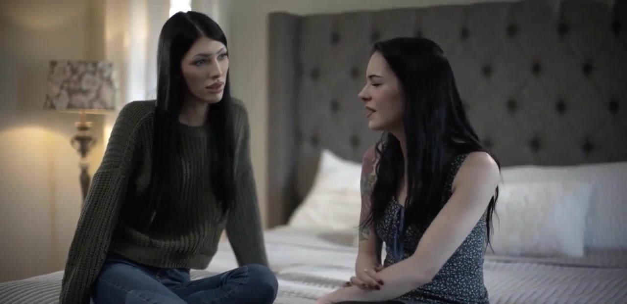 Tattooed stepdaughter asks trans stepmom Ava Holt to teach her how to kiss.They get horny and the big tits babe deepthroats her big tranny cock.The brunette shemale jerks off as she masturbates her shaved pussy.Then the small tits tgirl fucks her