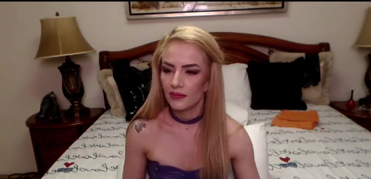 Sexy blonde amateur trans Melissa chatting on her computer then in bed showing head of her big cock sneaking from her black panties then wanking her huge cock on webcam