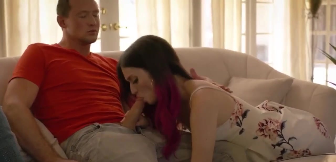 Small tits and pale shemale Natalie Stone is with her horny stepbro.The redhead tranny and the dude exchange kisses.The trans babe deepthroat blowjobs his cock on the couch.The guy bareback anal fucks her tight asshole in several positions.