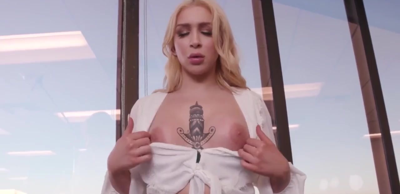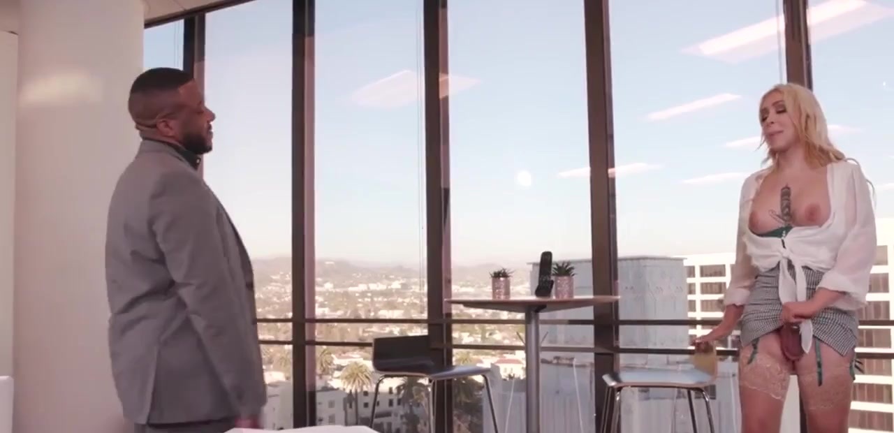 Busty tbabe Angelina Please flirts with hunk black stud in the office and makes him blowjobs her big tranny cock after she deepthroats her huge dick. The big assed shemale stretches her gigantic ass to take his bbc for a hardcore anal bareback ride.