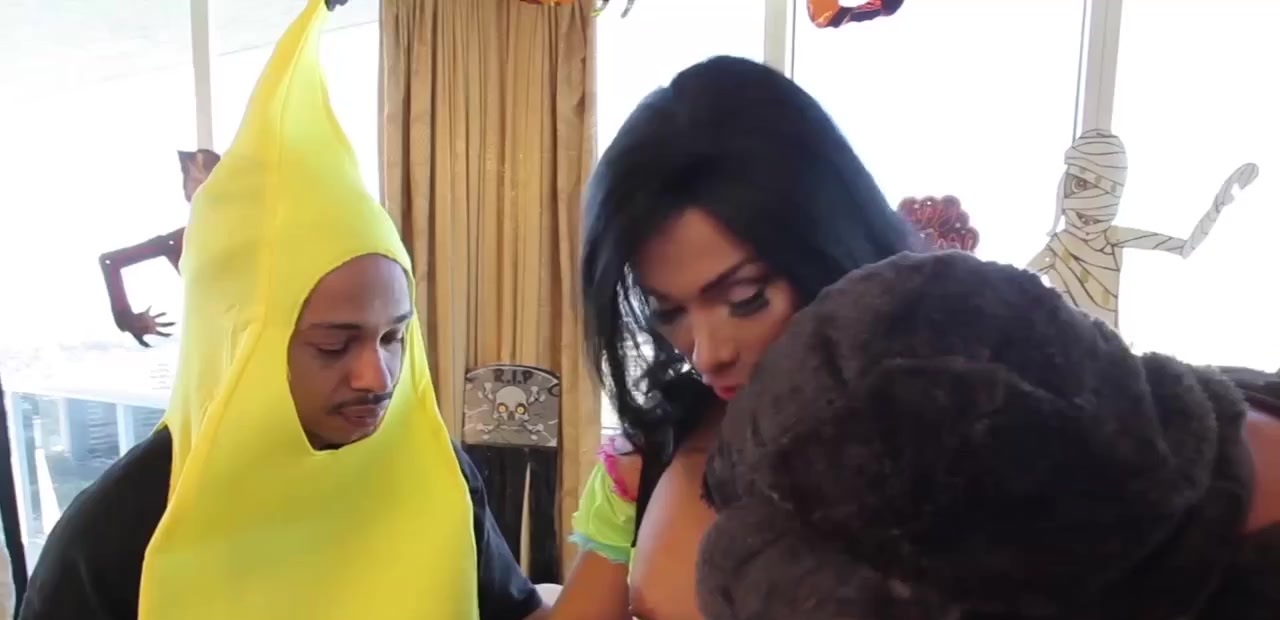 Cute tbabe in a revealing costume has some fun with two massive cocks that are willing to plow her.