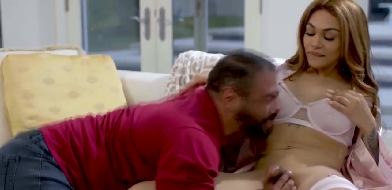 Tgirl cheater Eva Maxim welcomes her new boyfriend into her big house.She lets him throat her hard shecock passionately and after that,she lets him lick her tight ass first to makes it wet before he bareback fucks it so hard.