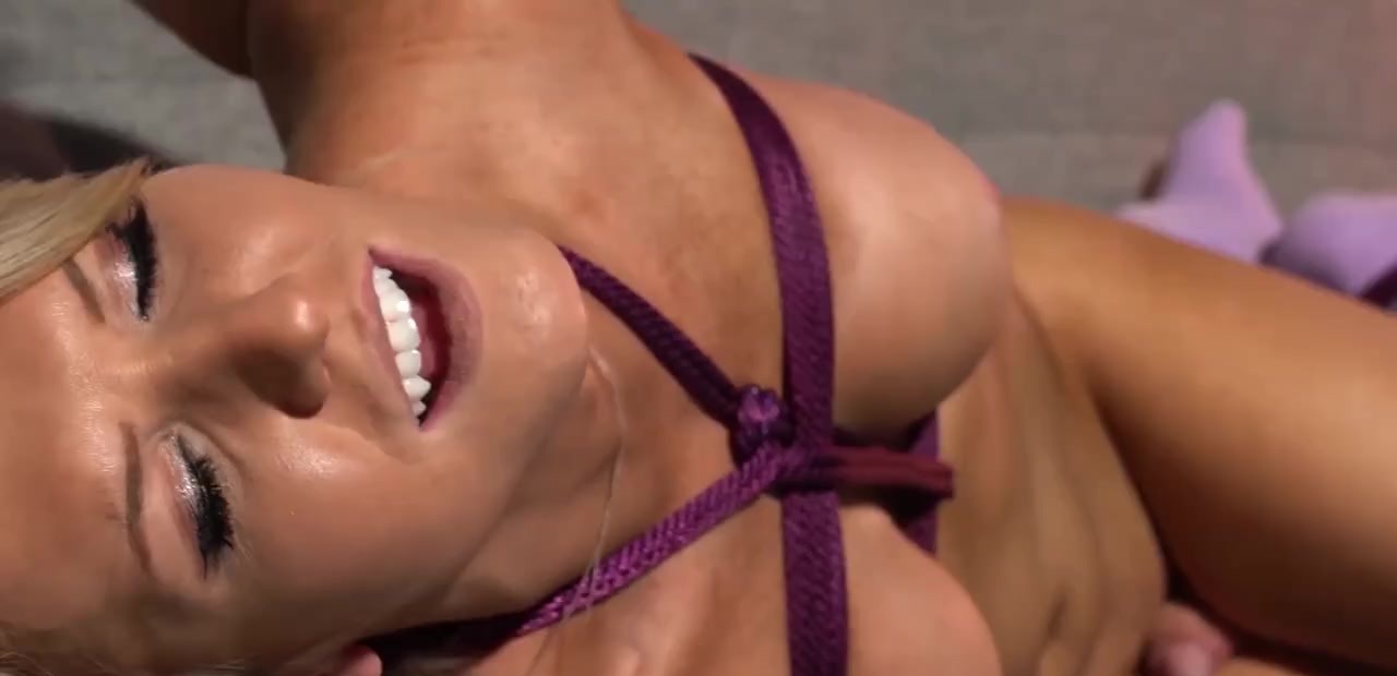 Submissive tied up pornstar shemale Kayleigh Coxx sucked big cock before doggystyle ass drilled and sprayed all over her face with warm cum.