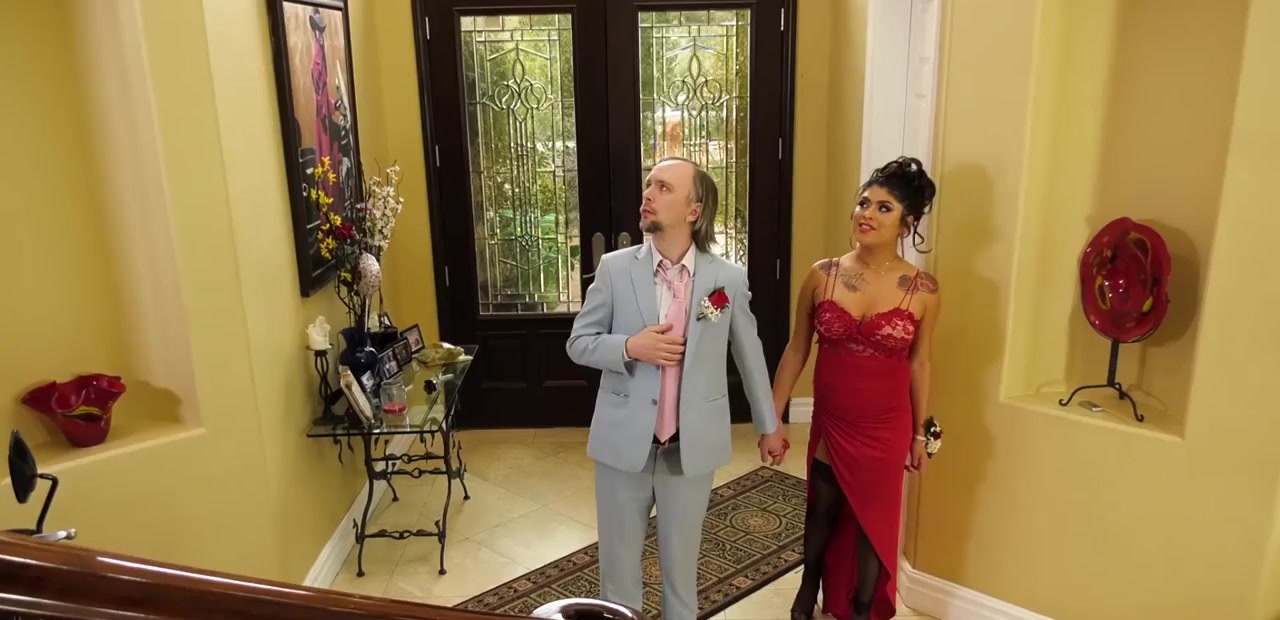 Filthy transgender sucks a businessman's cock in the hall before fucking him hard on a couch.