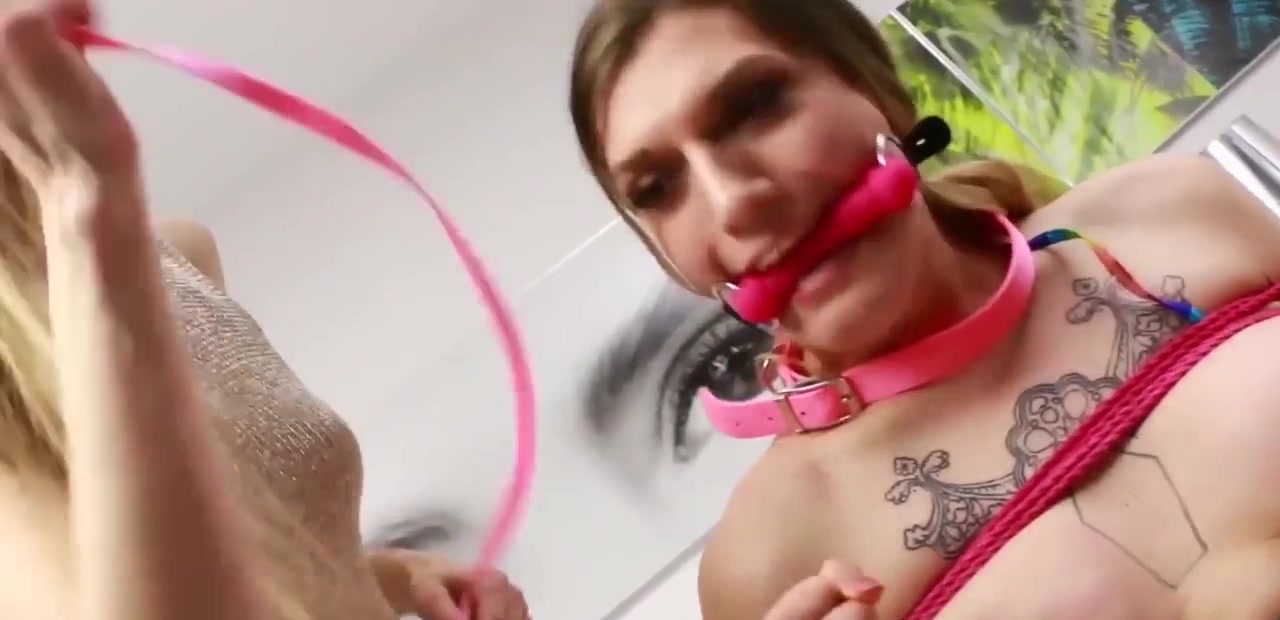 Kinky trans babe River Enza ties and spanks fellow naughty tranny before dilling her tight ass with big dildo hardcore!