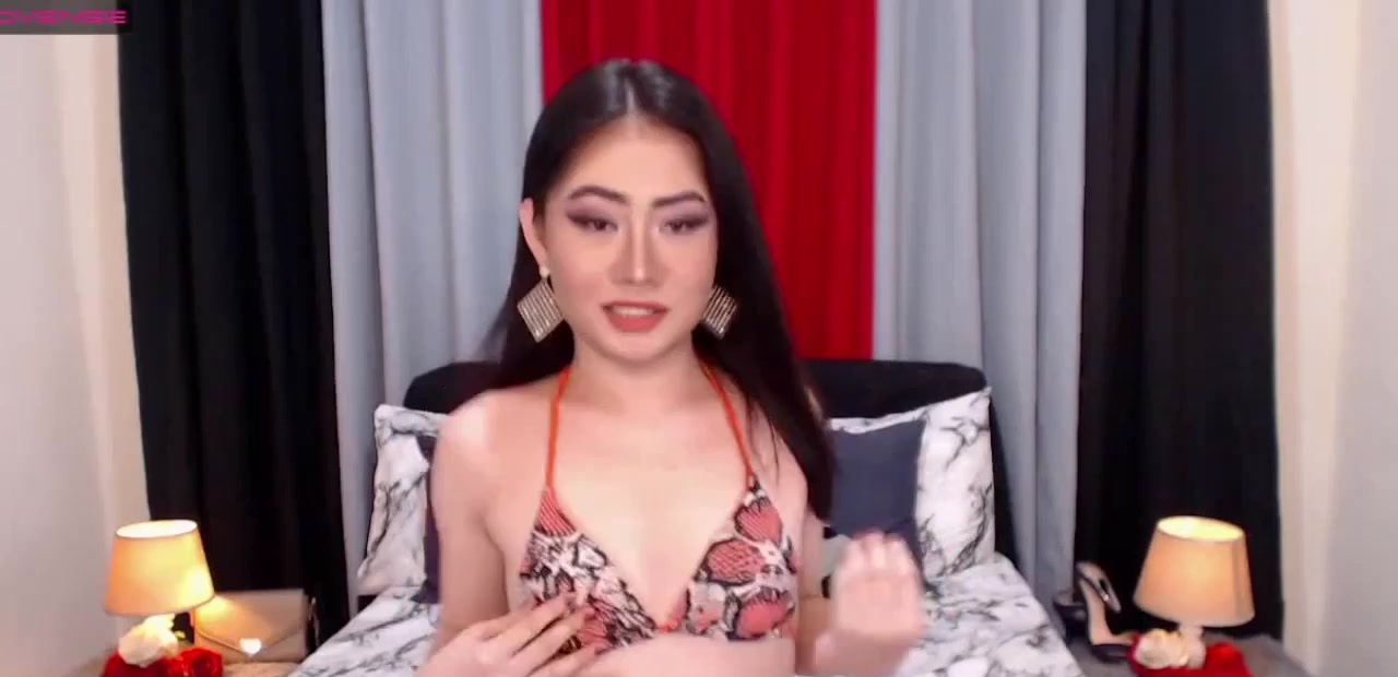 Small tits brunette Asian trans amateur teen Nicole posing in bikini in front of webcam then stripping off and jerking off dick with legs wide open in her bedroom
