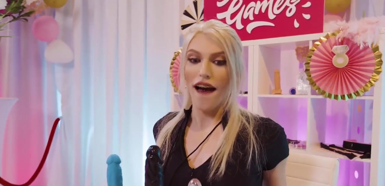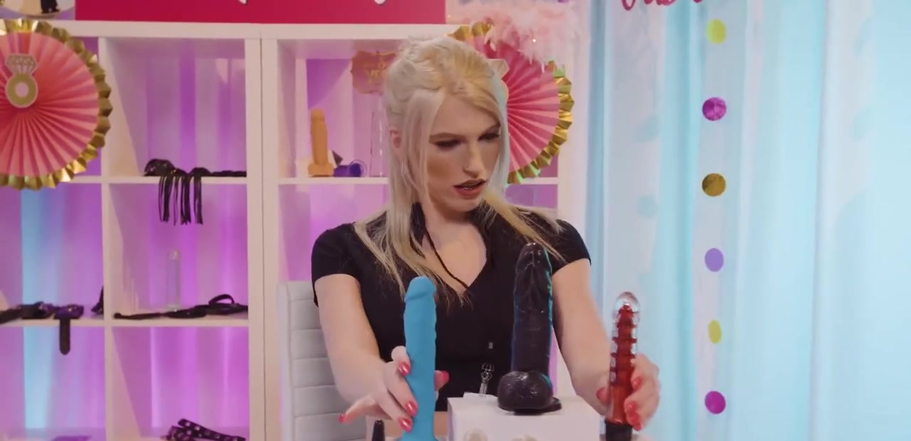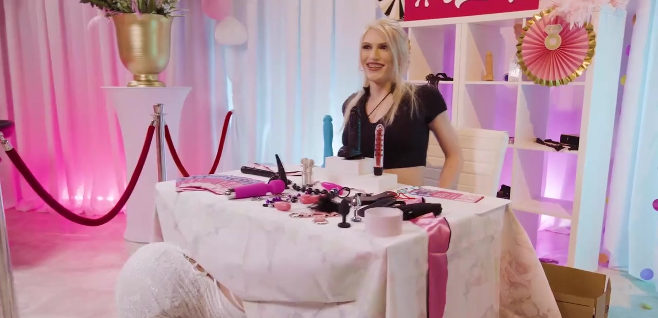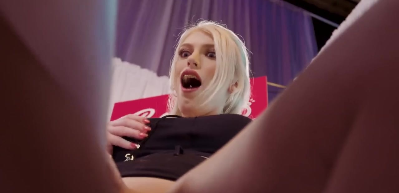 Whitney Wright's first sexual experience with tranny Izzy Wilde takes place at a wedding expo where Izzy is displaying various sex toys. Whitney starts sucking Izzy's cock under the table under Izzy's boss Lauren Phillips catch them only to minutes later find herself gag balled!