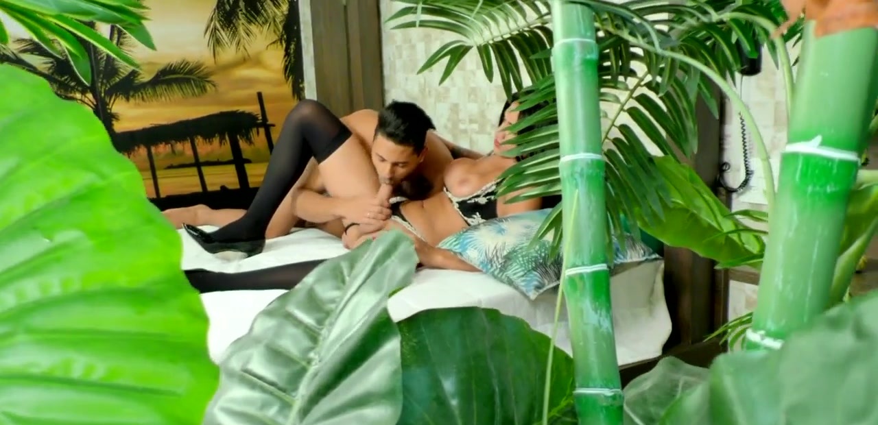Horny tranny invites a guy to her room He sucks her tits and dick Then she takes his dick in her asshole and get fucked in many positions He cums in her mouth in the climax