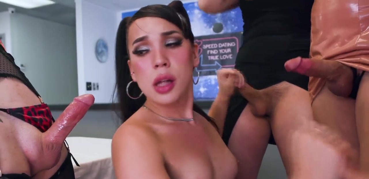 Kasey Kei decided to attend a speed dating event with a group of other trans women. Jenna Creed doesn't even want to go to the next table. Jenna ducks under Kasey's table and starts sucking her hard cock, which Kasey loves. Ivory ducks under the table to give Kasey a double blowjob with Jenna