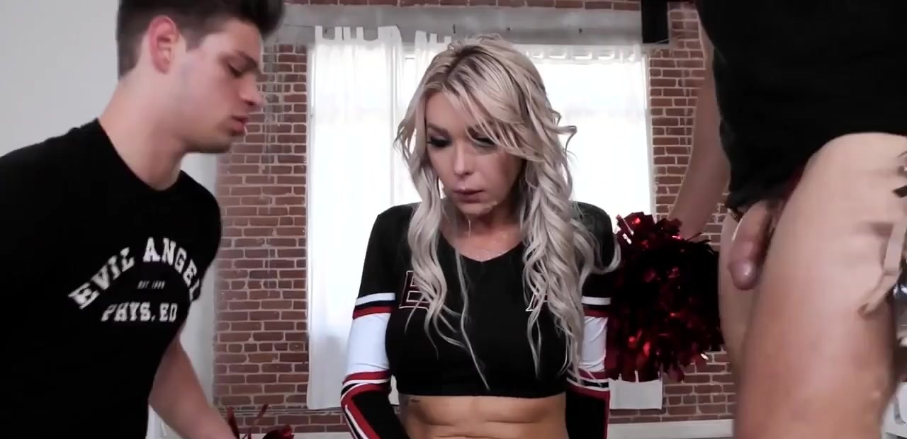 TS cheerleader babe enjoys facial jizzing bareback 3way
