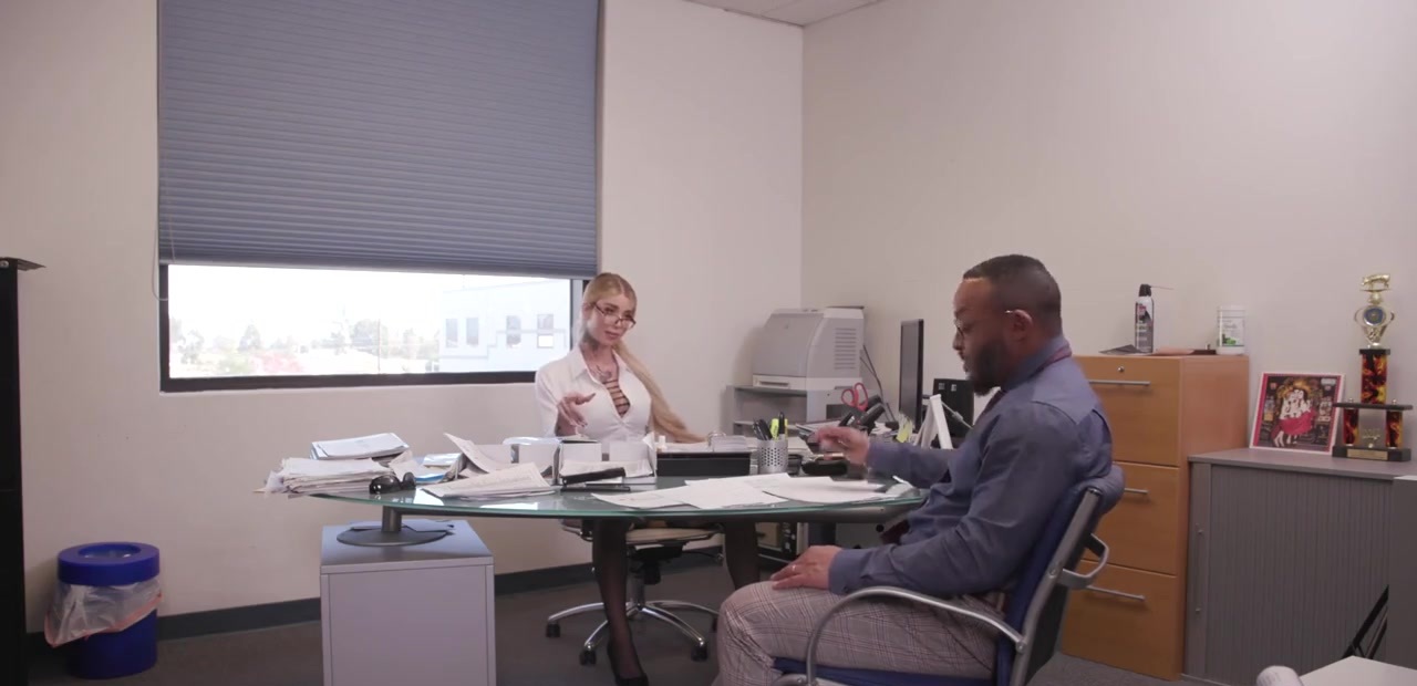 Dillon Diaz goes to shemale office Grace Jane, after talking with each other Gracie open her skirt and let Dillon lick and blow her cock. After she let Dillon blow her cock it is her turn to give the favor and give Dillon a nice deepthroat. Dillon fuck her boss at the sofa in different position