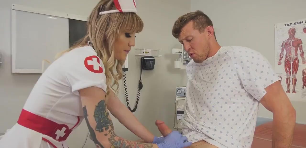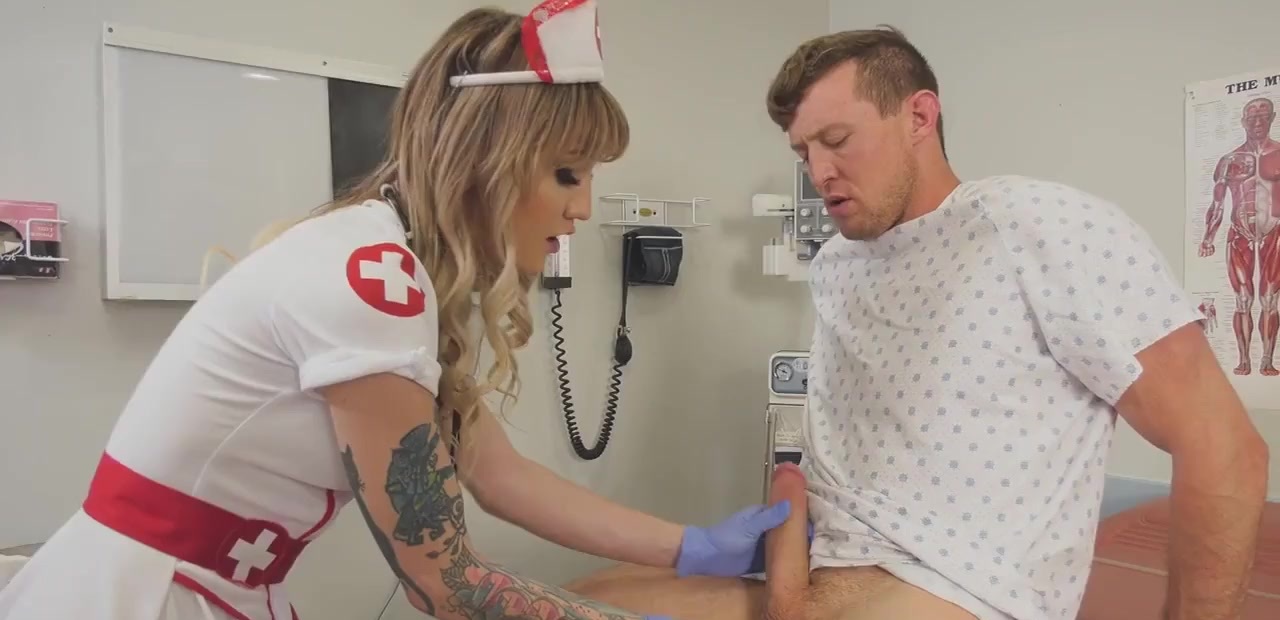Rimmed TS busty ink nurse in fishnets assfucked by patient