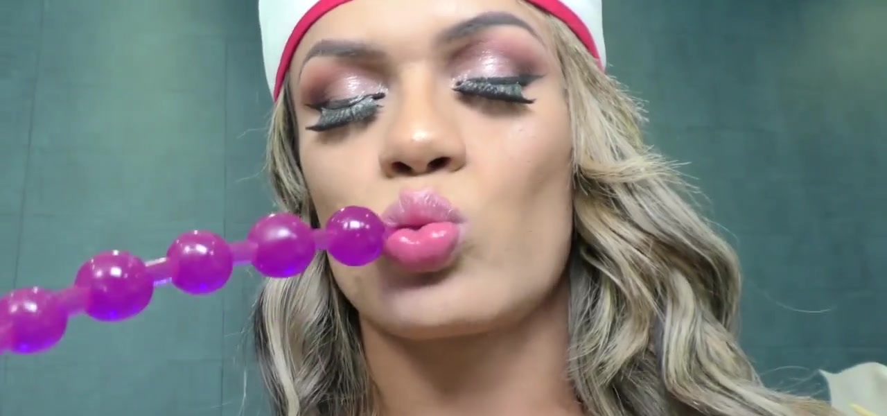 Sexy tranny nurse enters to the scene with a box of sex toys She takes anal lead and start sucking it while playing with her tits Then she inserts in her asshole and stroke her dick so good