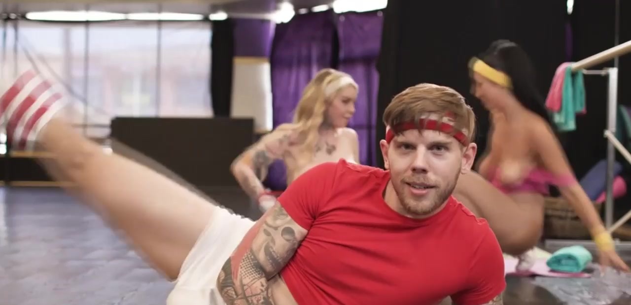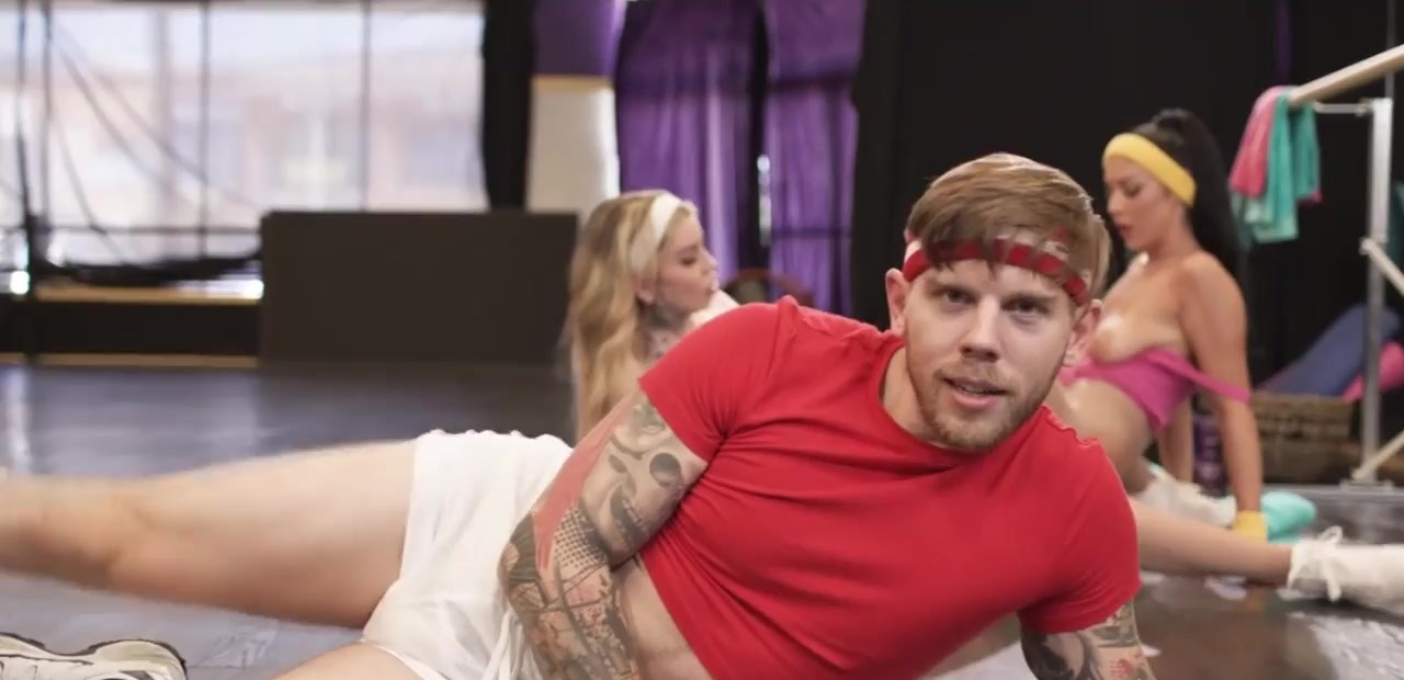 Busty shemale fucks her busty gym buddy and rides coach cock