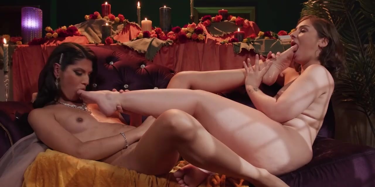 Big cock shemale Zariah Aura and petite Tommy King suck feet