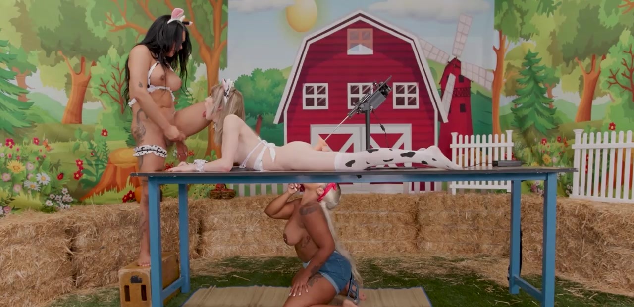 Big boobed ebony farmgirl Eva Maxim milking and fucking two tranny dicks