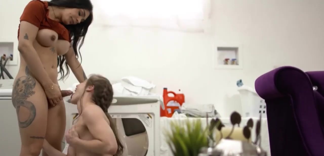 Busty trans maid enjoys fucking her boss while stuck on washing