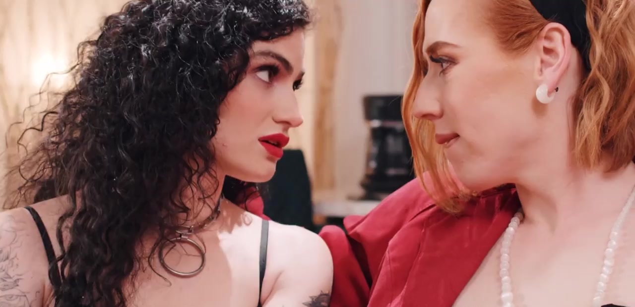 Tattooed Lydia Black rides redhead TS Shiri Allwood cock