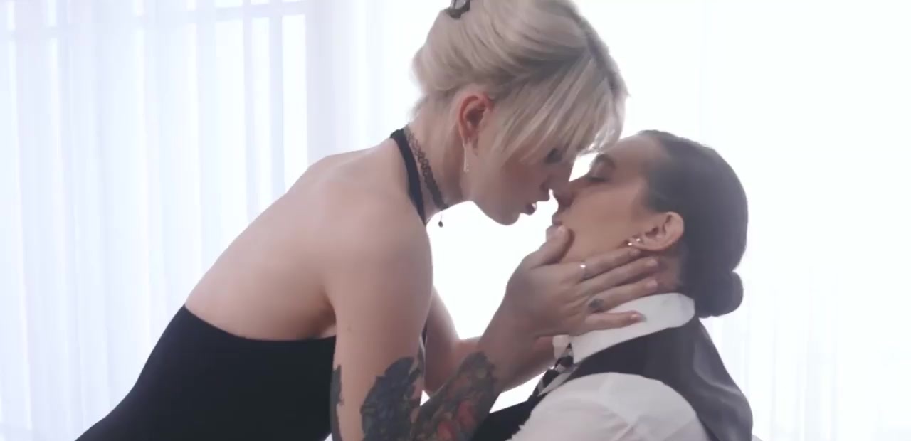 Blonde trans babe Lena Moon pounds hard lesbian Sinn Sage