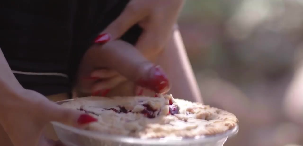 Busty shemale Tori Easton caught fucking a pie and is sucked