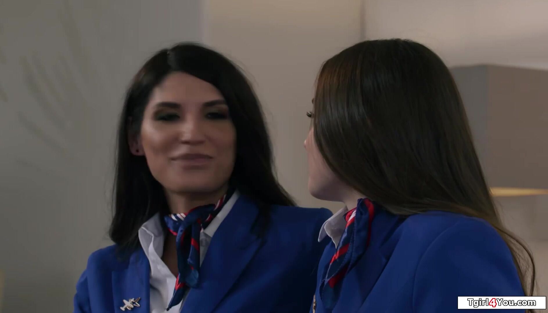Shemale flight attendant Zariah Aura and her busty colleague Hazel Moore stay the night.The latin tgirl licks and fucks the brunettes hairy pussy