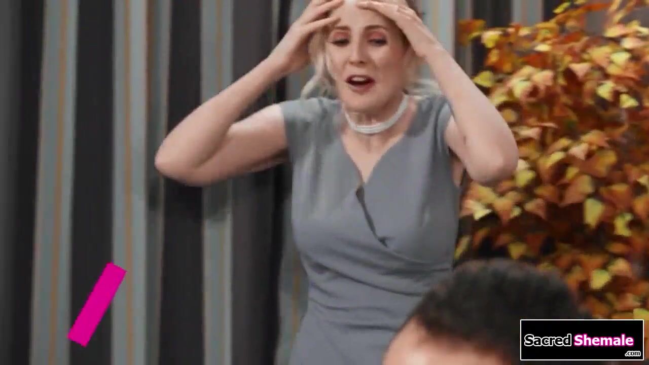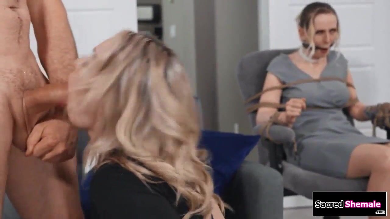 Boss anal fucks maid Emma Rose and his wife catches em.The tgirl ties her and she sucks his cock.The wife gives him a footjob and the ts is barebacked