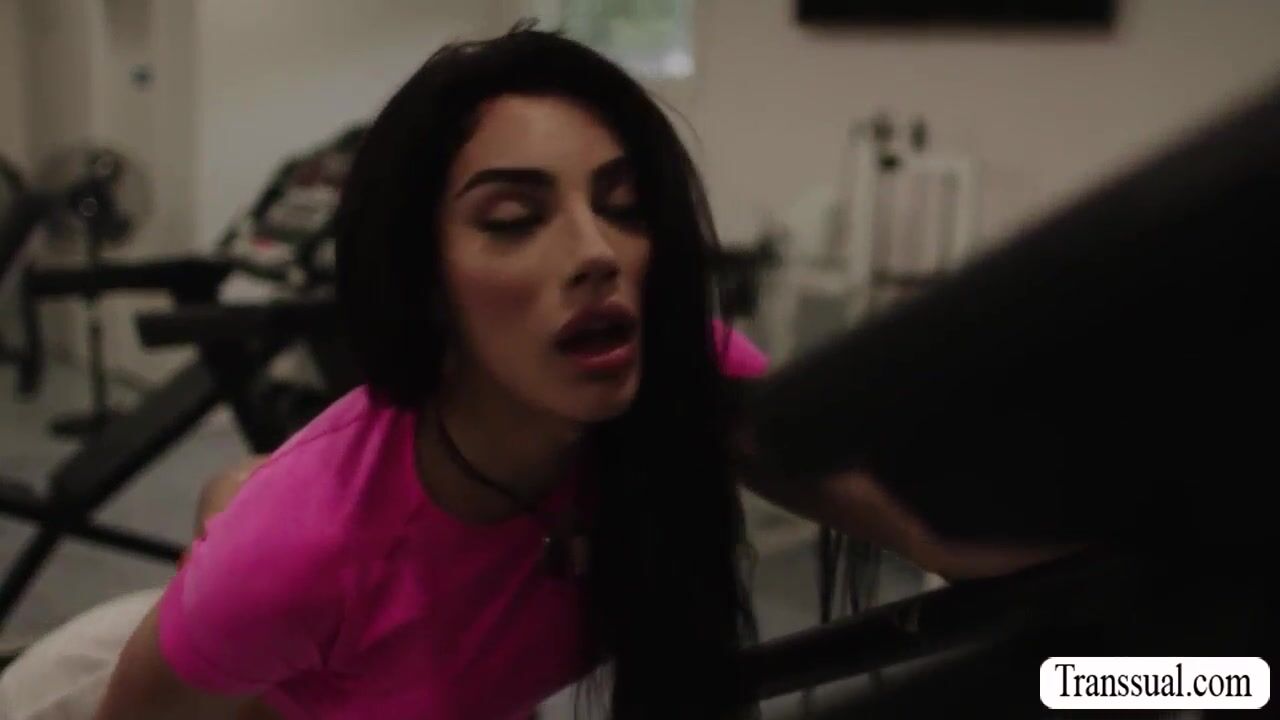 Bald guy cant stop starring at the ass of busty shemale while working out.After that,he licks her ass and barebacks it.