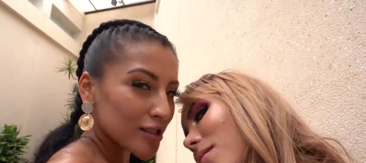 Bigboob Latina ts fucks pussy and gets breeded in threesome