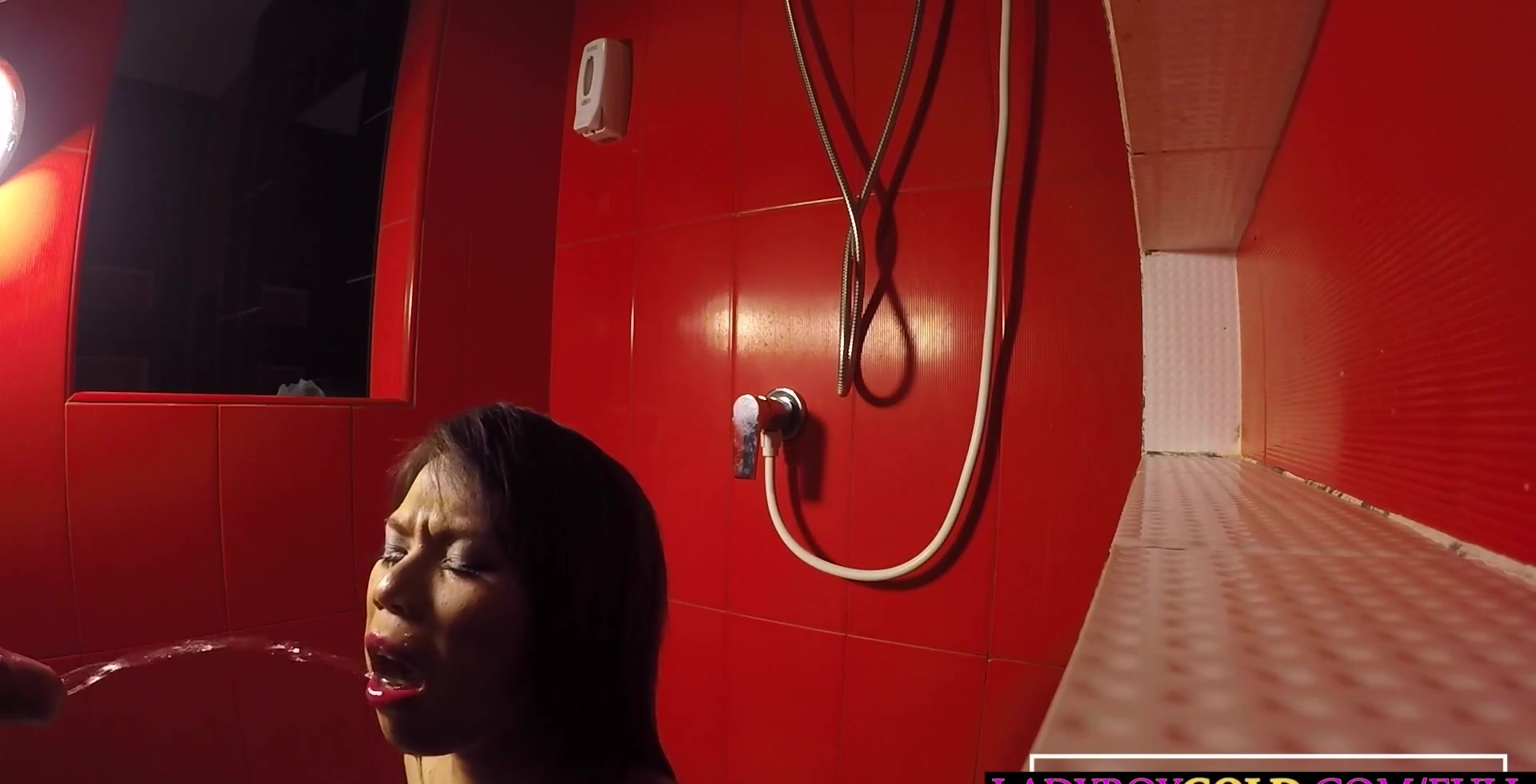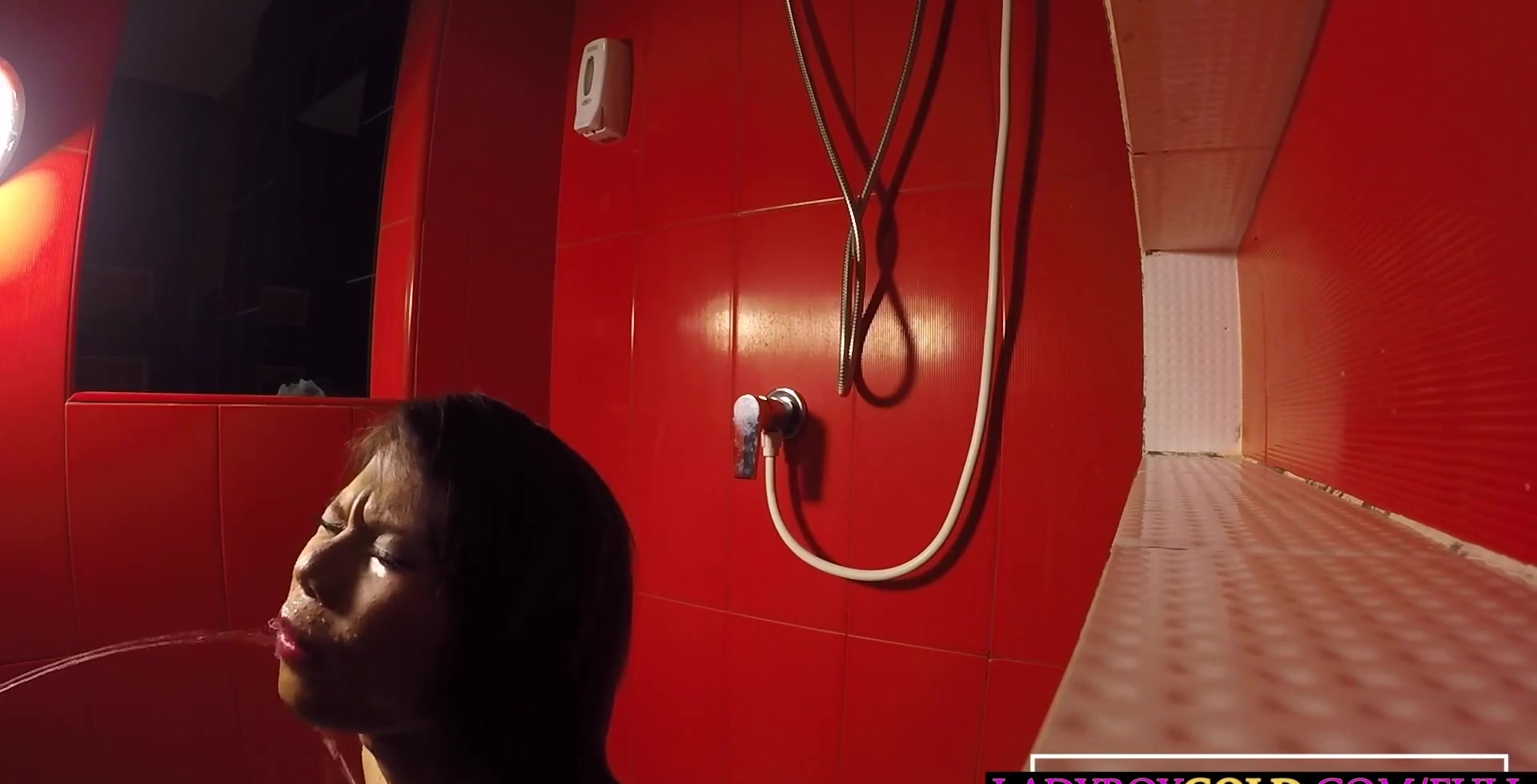 Teen ladyboy mouth pissing and sucking his big white cock in the shower