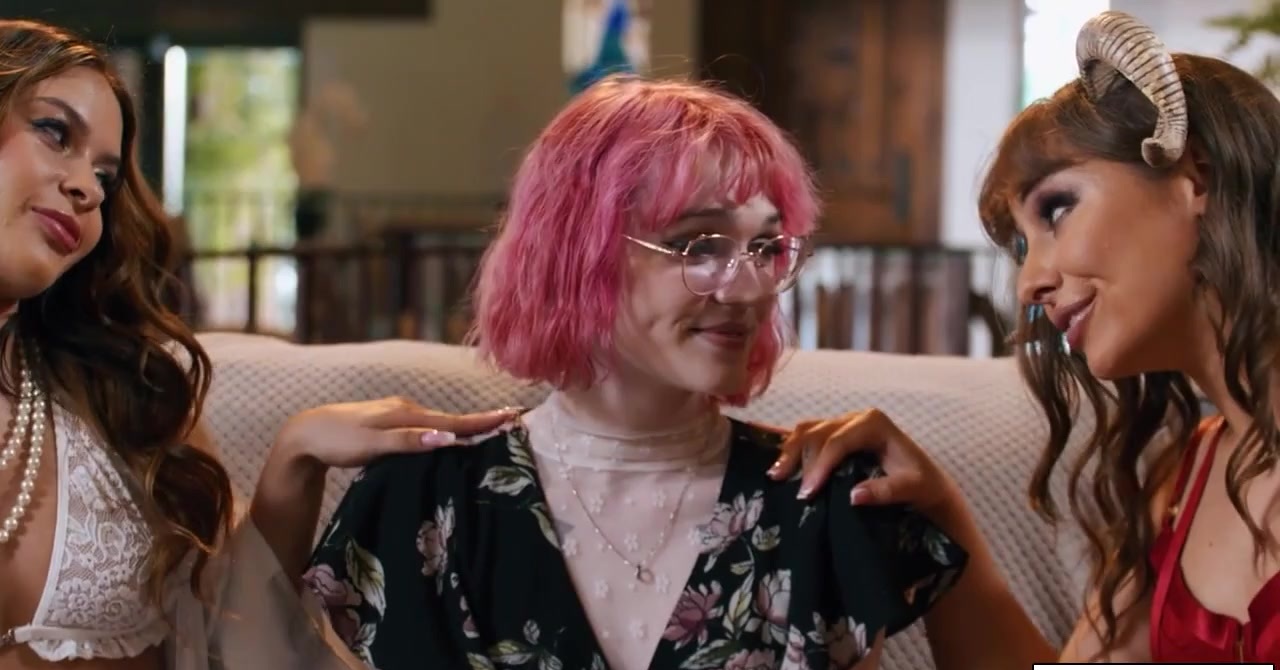 Devil and angel fight over small tits trans Claire Tenebrarum and share her in 3some.The petite babe deepthroats her small tranny cock and the tgirl is rimmed as she fucks her.The devil fucks the brunette with strap on toy and gives the ts a footjob