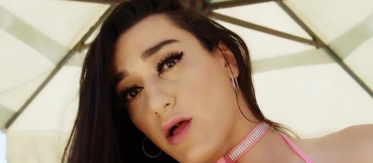 Busty TS Bambi Bliss shows off her big boobs poolside at a beautiful Las Vegas hotel. She kneels to sucks adventurous stud Mason Lear's thick boner, and he returns the favor, giving her a tasty blowjob. They head inside to a fancy hotel room, indulging in a deep anal cock ride