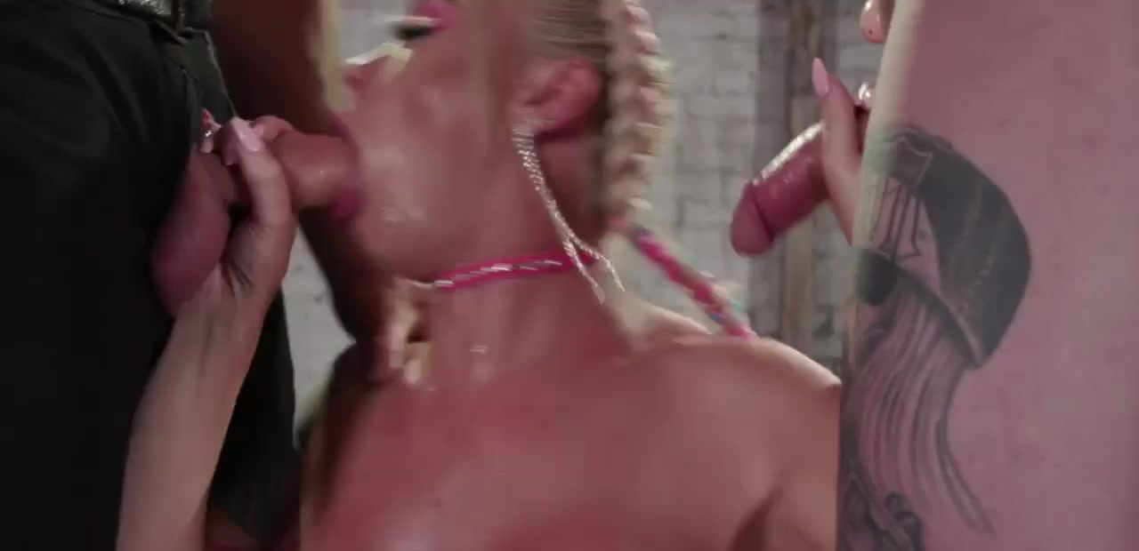 Super star shemale Aubrey Kate is sucking some sex toy passionately and after that,she throats the two big cocks in front of her.Next is,she gets naked and lets them bareback her wet ass so deep and hard.