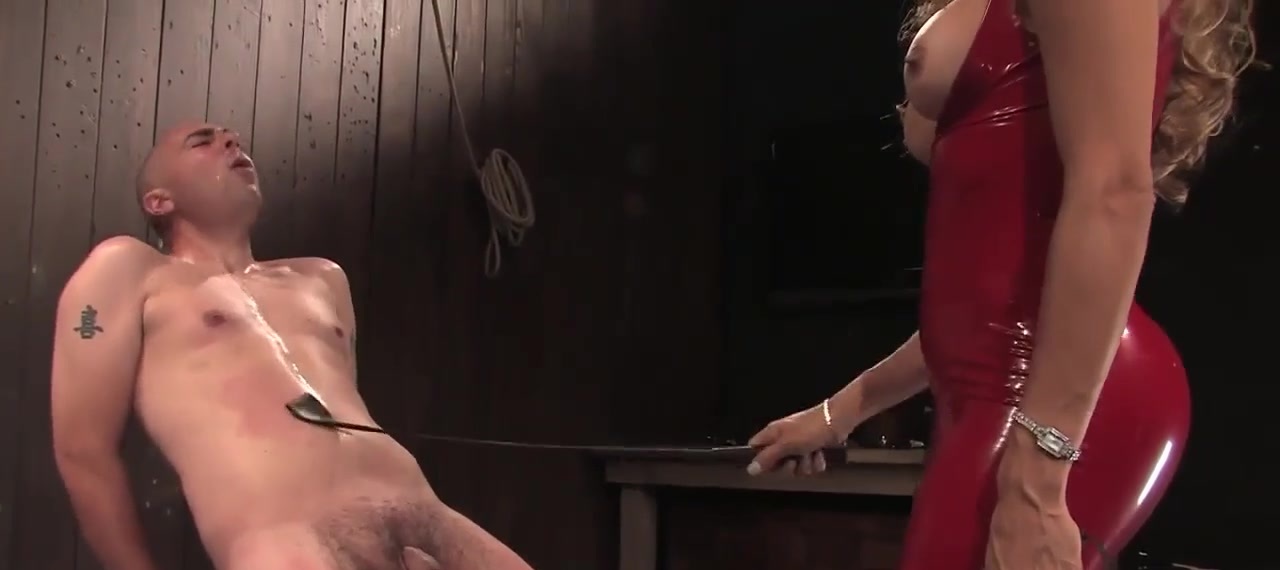 Big tits blonde mature tranny dominatrix Johanna B in red latex dress flogging bound man slave Tyler then anal fucking him with big cock in dungeon